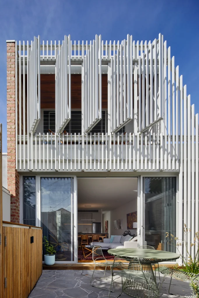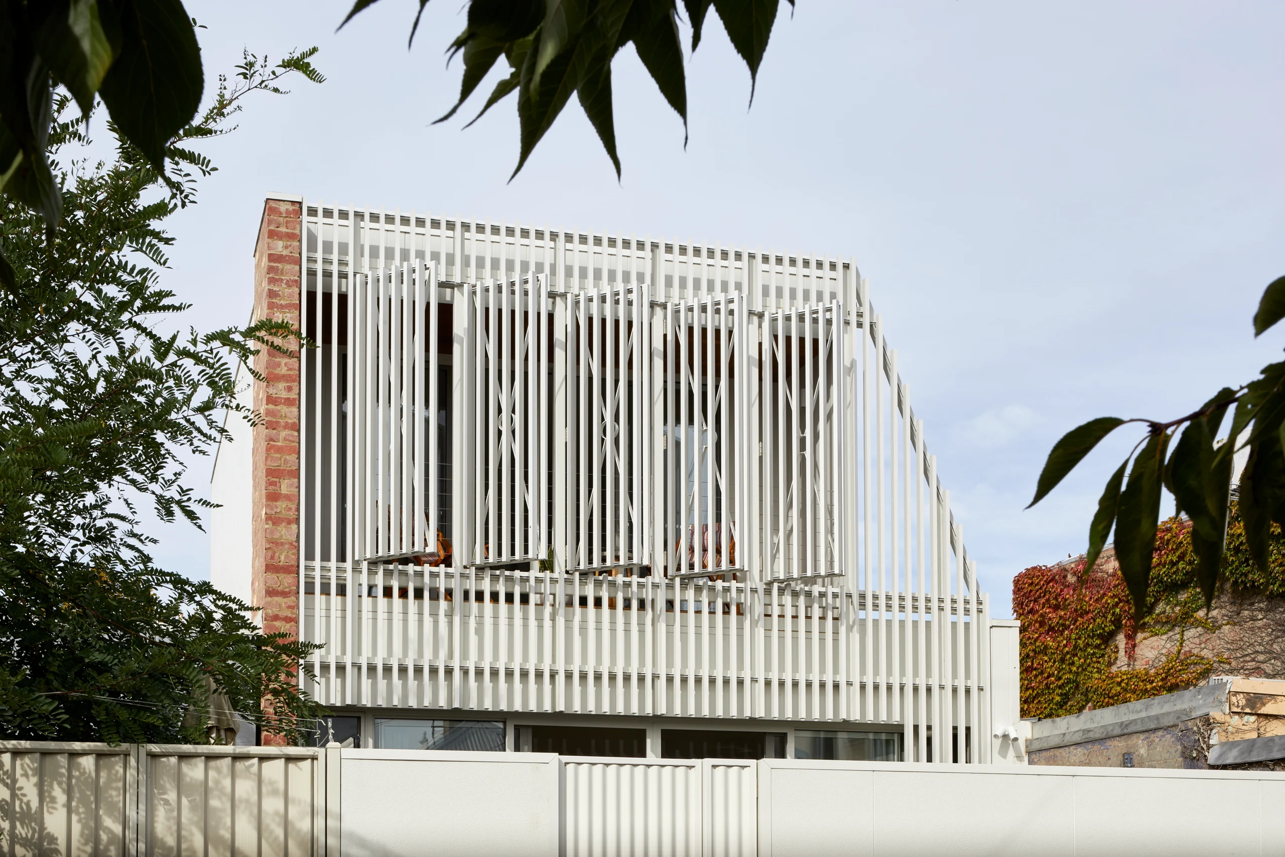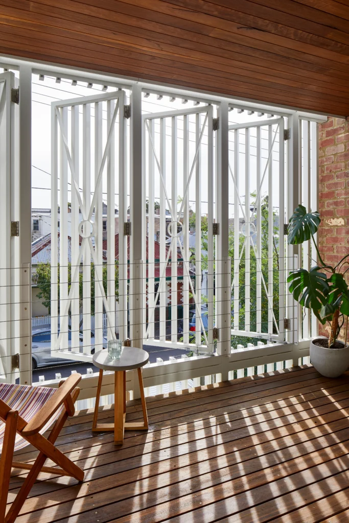At the upper level, privacy becomes a more visible architectural driver. Operable battens and steel screens temper overlooking and sunlight, particularly to the main bedroom balcony, while still allowing filtered views to the surrounding rooftops and trees.