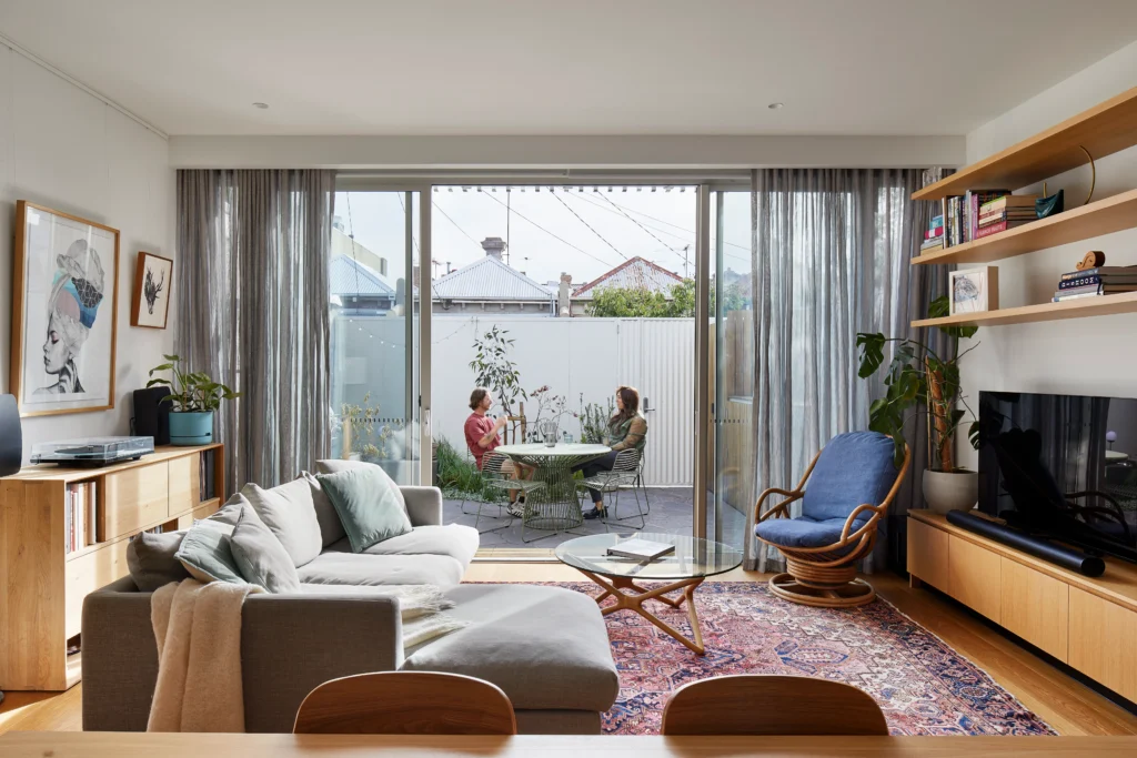 Located near Edinburgh Gardens, OH House is an alterations and additions project on a dual-frontage site. The approach was deliberately split. The street-facing elevation remains respectful of its Victorian context, while the rear adopts a more contemporary language, drawing on the area’s long tradition of incremental architectural change. Rather than expanding upward or outward, the footprint barely increases, preserving precious courtyard space and allowing light and air to do more of the work.