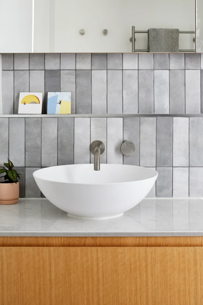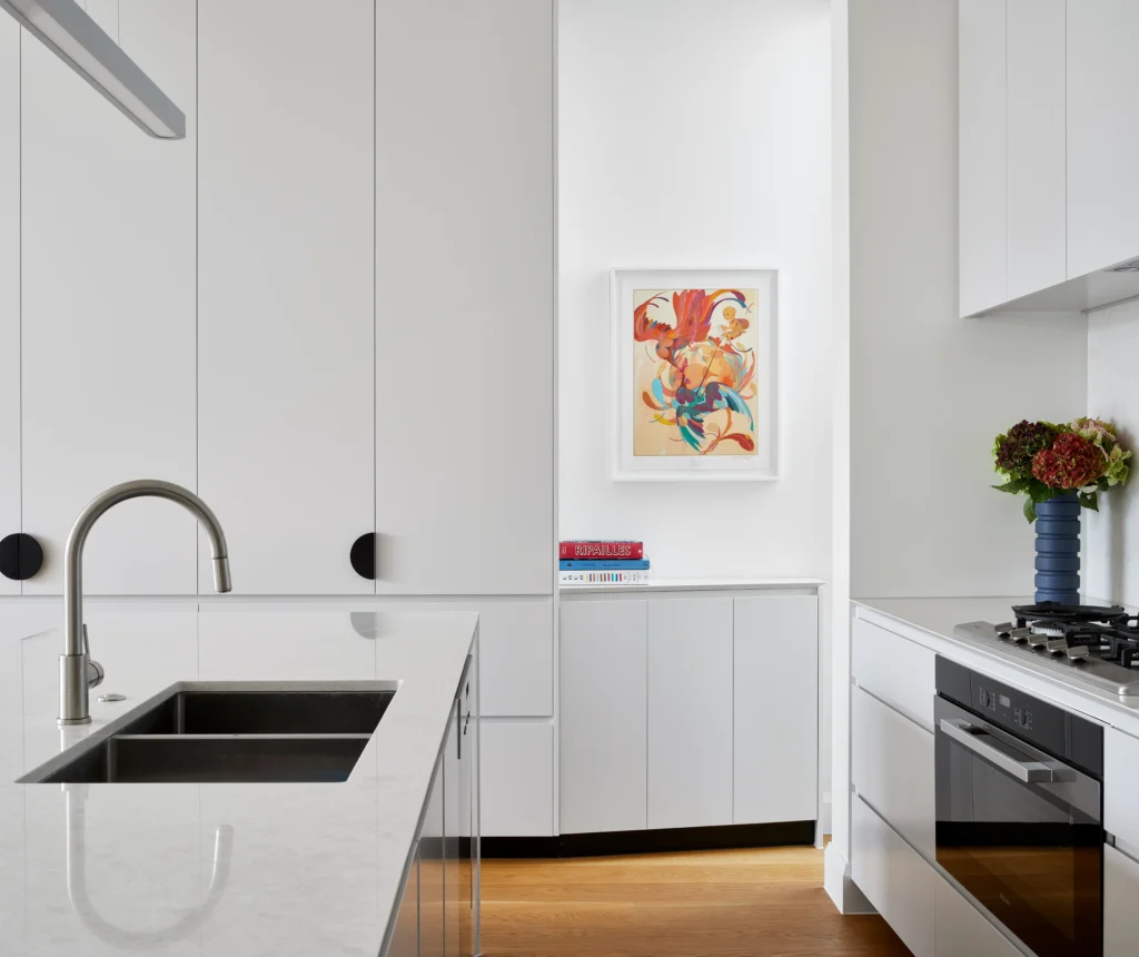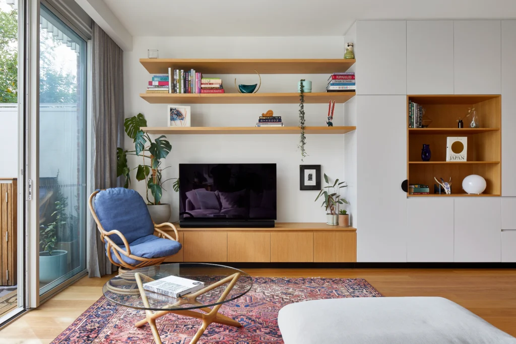 Material choices reinforce this sense of continuity. A restrained monochrome kitchen palette is softened by tongue-and-groove timber flooring, while European oak joinery and bespoke furniture bring warmth to the living spaces. Long, finely detailed shelves accommodate the owners’ collection of Japanese objects, giving the lounge a quieter, more introspective character.