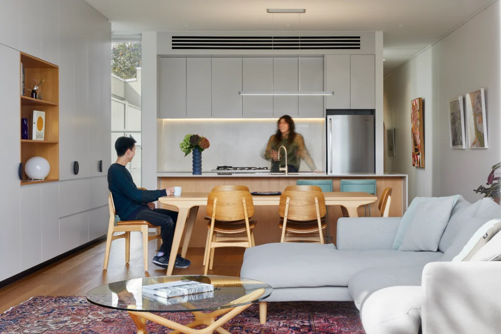 Internally, the project is less about addition than reorganisation. Dark, inefficient rooms have been reworked into a compact but generous ground floor, centred on the kitchen. One of the owners is a professional chef, and the kitchen was always intended to be the social heart of the house. Positioned beside the new stair, it stitches the original rooms to the rear addition, dissolving the usual hierarchy between cooking, dining and living. Large sliding doors open directly to the landscaped courtyard, extending daily life outdoors.